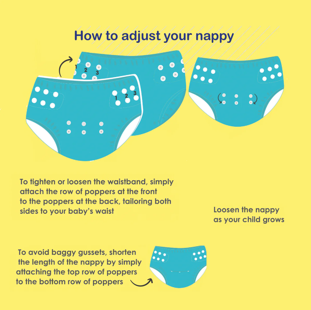 The Size Adjustable Under Nappy can also be worn on its own and is an eco-friendly alternative to disposable swim nappies. Designed to be long-lasting to fit for over a year, simply use the next row of poppers to provide extra room in the nappy when your baby grows.